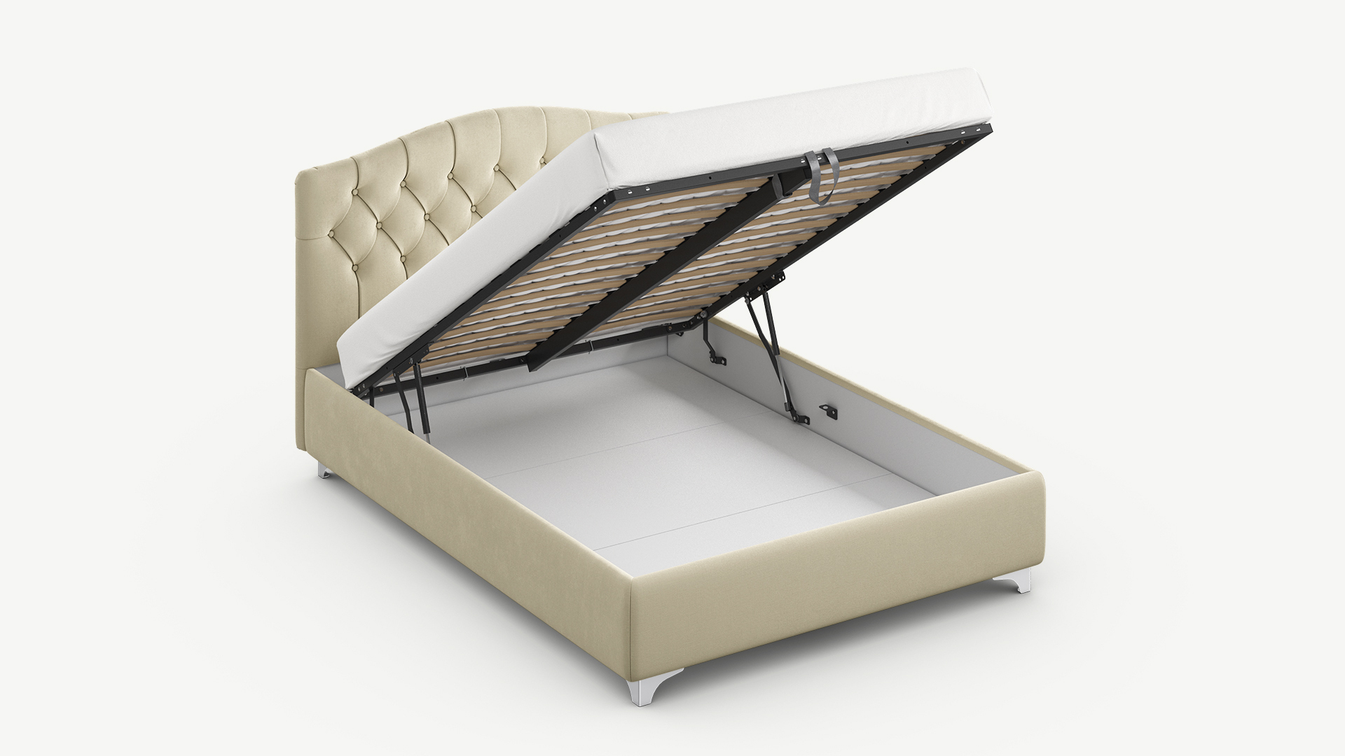 - Скрытая под основанием вместительная емкость без внутренних перегородок позволяет использовать всю площадь подкроватного пространства для хранения вещей.