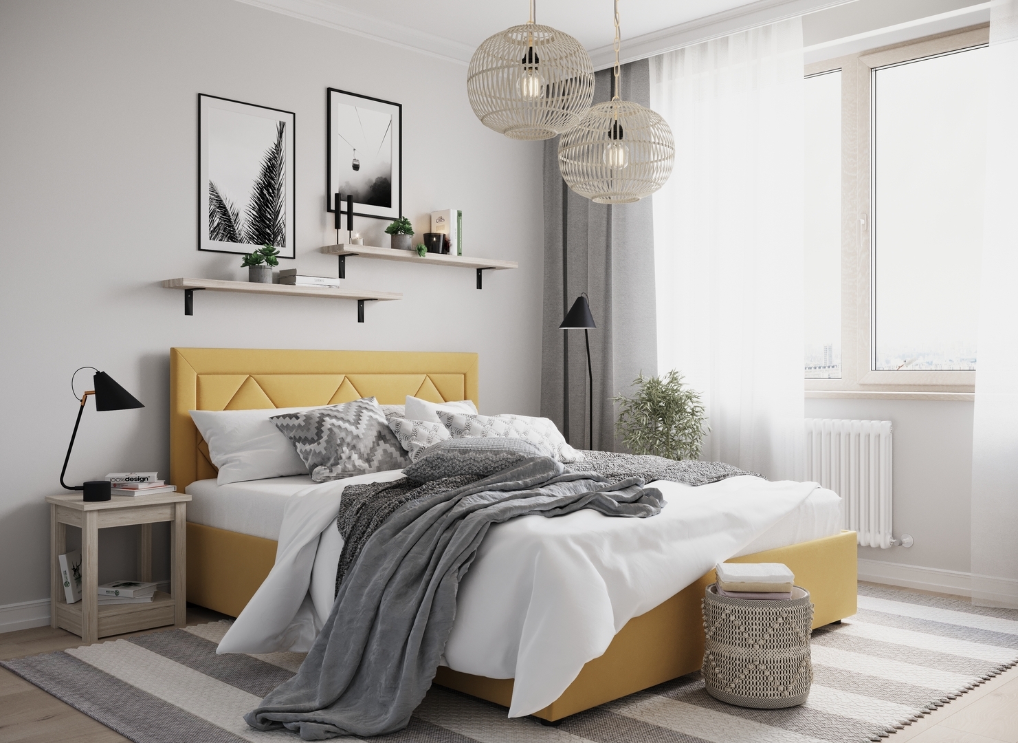 Создать гармоничный интерьер и завершить образ спальни помогут дополнительные аксессуары, например: тумбы, банкетки, подушки.