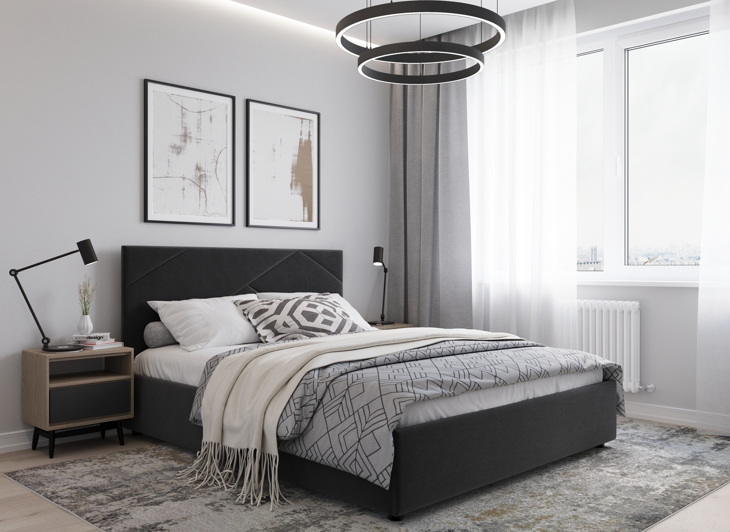 MOON FAMILY 1257 привлекает внимание оригинальным исполнением: широкие полосы ткани эффектно пересекают периметр изголовья, создавая на нем графический орнамент. Лаконичные формы объемных царг создают единый гармоничный образ и фокусируют внимание на центральном текстурном элементе кровати.