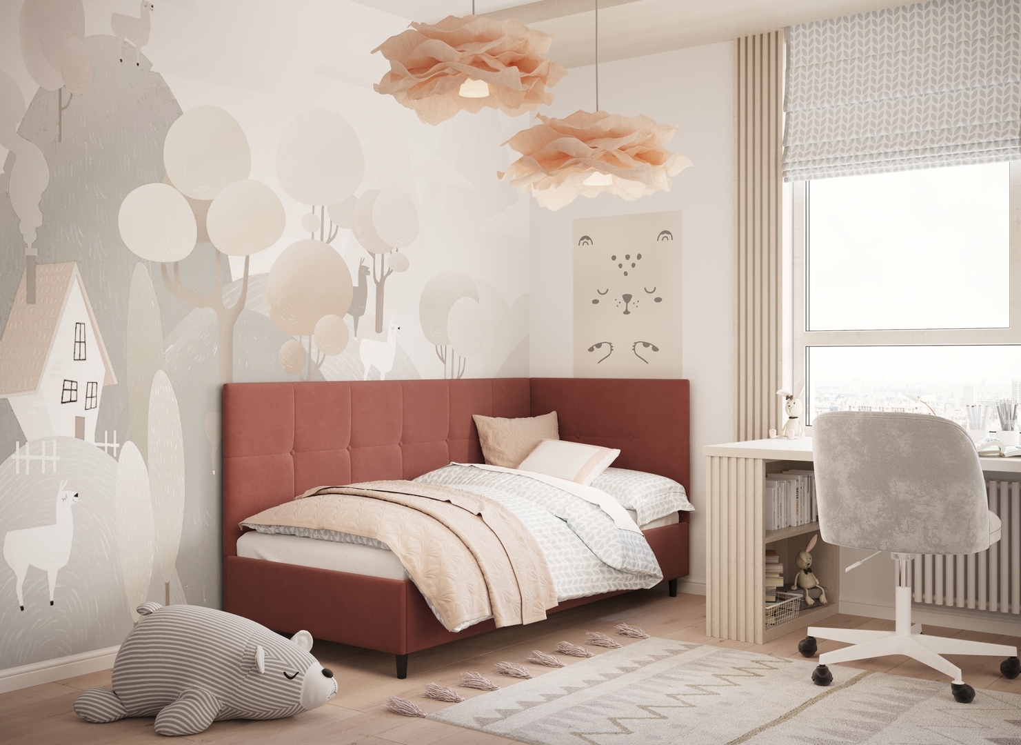 MOON FAMILY 1261 объединяет функциональность и стиль, создавая гармоничное пространство для отдыха и творчества. Кровать доступна в левостороннем и правостороннем исполнении, что позволяет легко адаптировать ее под любые интерьерные особенности.