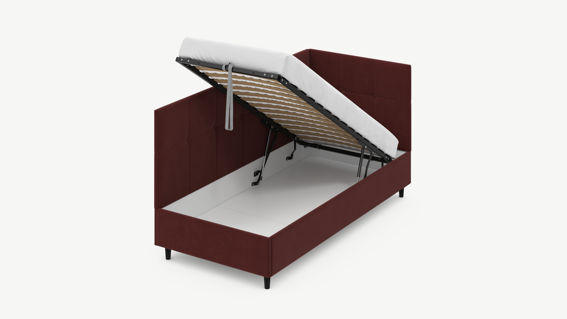 • Регулируемый подъемный механизм имеет два положения установки газовых амортизаторов в зависимости от веса матраса. Это дает возможность оптимально подстраивать угол подъема основания, а также плавно и бесшумно поднимать и опускать спальное место.