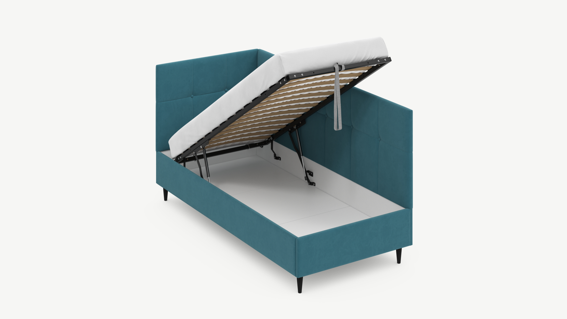 • Скрытая под основанием вместительная емкость без внутренних перегородок позволяет использовать всю площадь подкроватного пространства для хранения вещей.