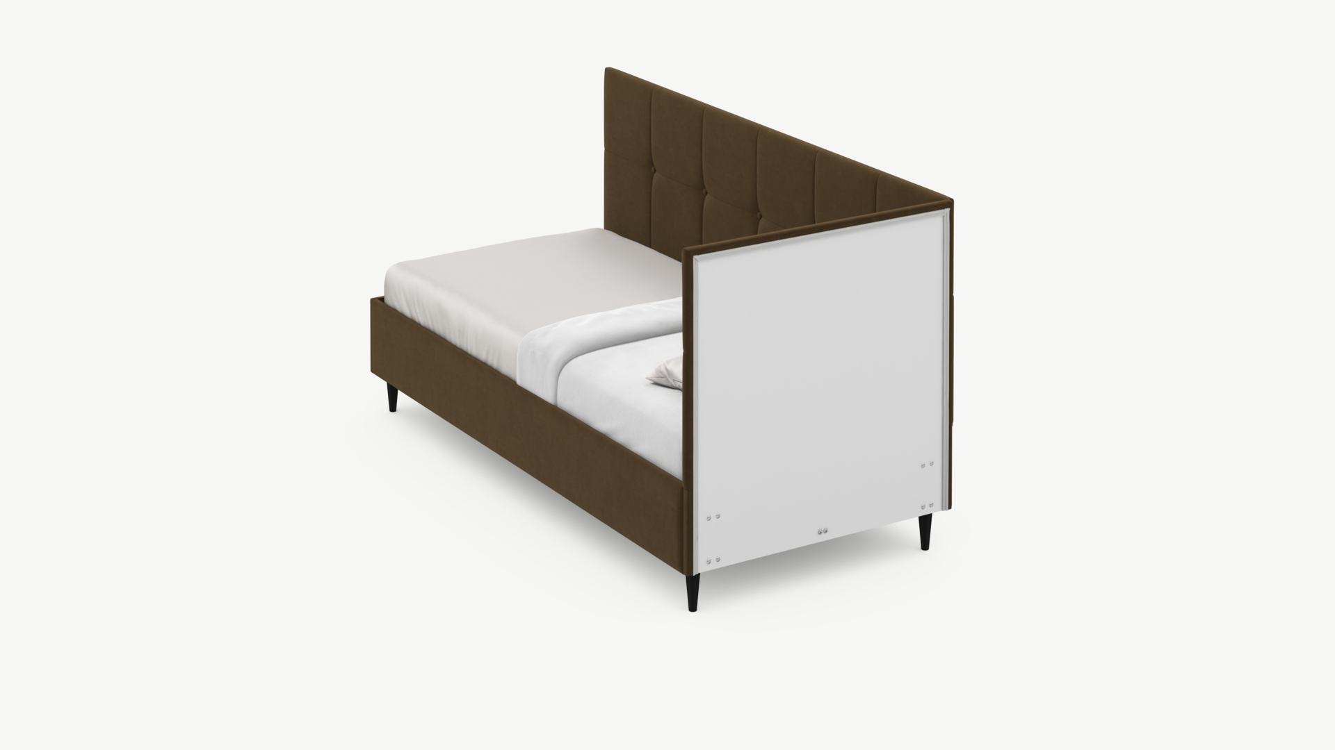 Угловая односпальная кровать MOON FAMILY 1261 с мягкой спинкой и изголовьем создаст в Вашей спальне ощущение уюта. Крупная квадратная стежка привносит в интерьер графических акцентов, а вставка из пуговиц наполняет пространство ощущением домашнего тепла.