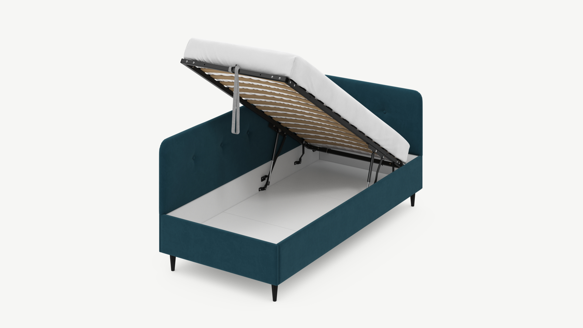 • Скрытая под основанием вместительная емкость без внутренних перегородок позволяет использовать всю площадь подкроватного пространства для хранения вещей.