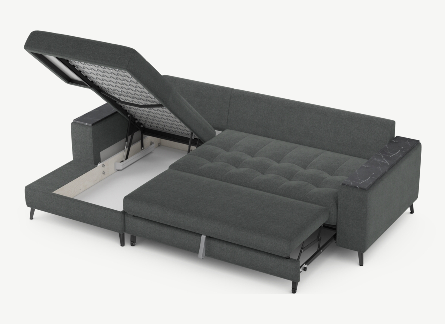 Секция «канапе» обеспечивает дополнительное пространство для отдыха, благодаря которому Вы можете располагаться с максимальным комфортом, удобно вытянув ноги. Под данной секцией расположен вместительный бельевой короб.